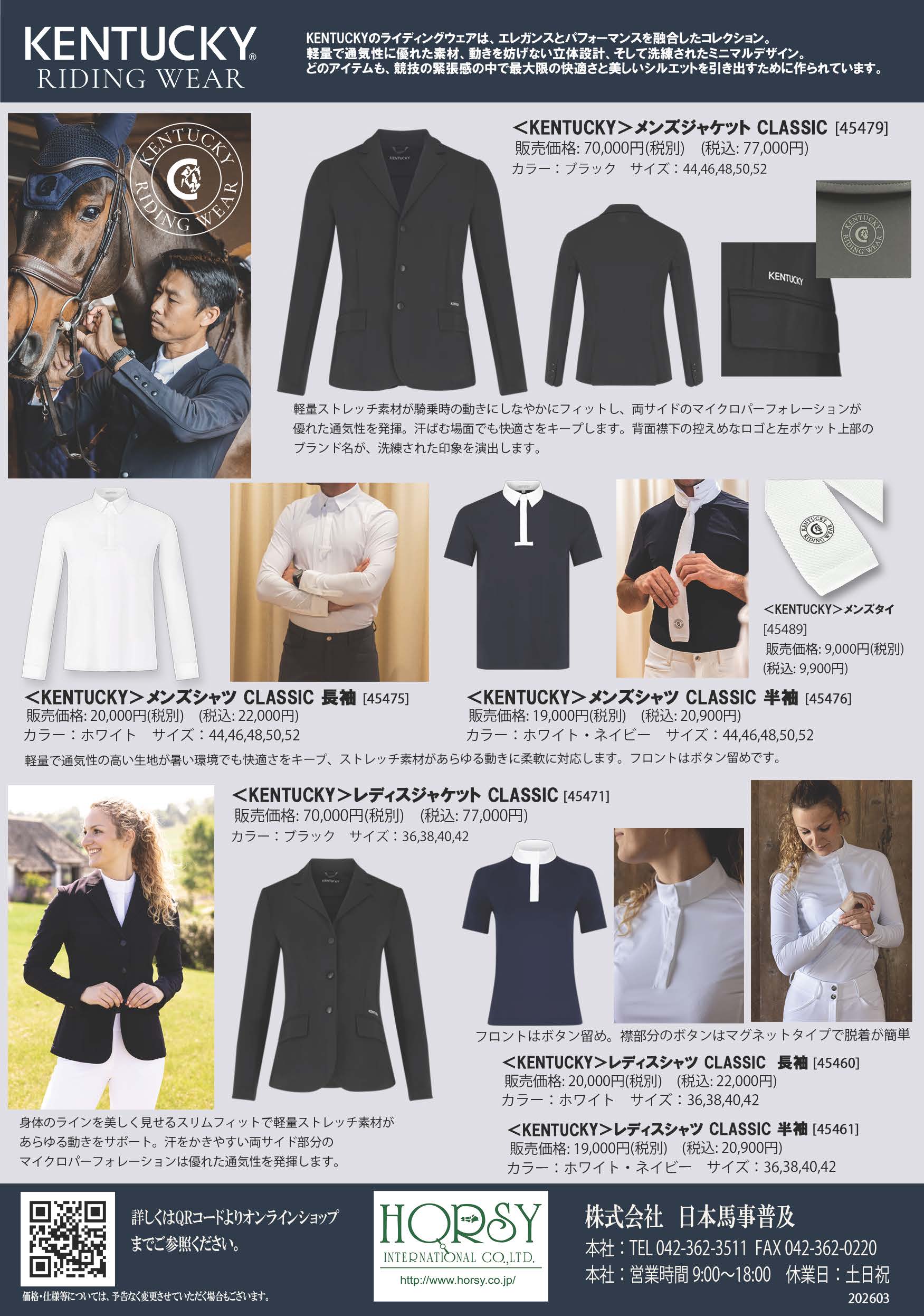 HORSEWEARで大人気のKENTUCKYより競技用ウェアが新たにラインナップ。 軽量ストレッチ素材・通気性に優れた素材を使用し競技会でも高いパフォーマンスを発揮します。